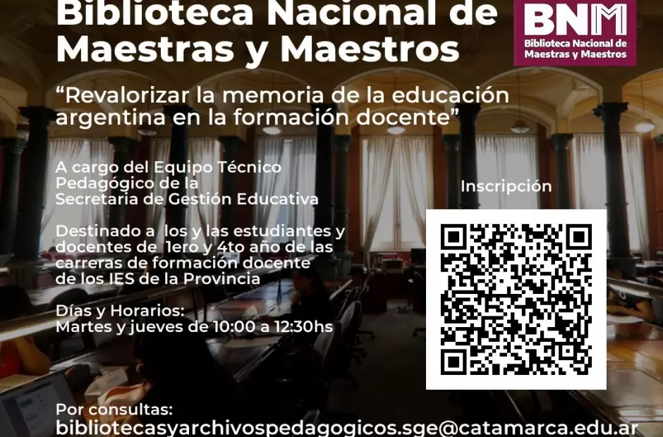 El Ministerio de Educación de la Provincia a través de la Secretaría de Gestión Educativa, en conjunto con la Biblioteca Nacional de Maestras y Maestros (BNM) invita a estudiantes y docentes de 1ero y 4to año de las carreras de formación docente de los Institutos de Educación Superior (IES), a participar durante los meses de octubre y noviembre de las visitas virtuales guiadas a la Biblioteca Nacional de Maestras y Maestros.