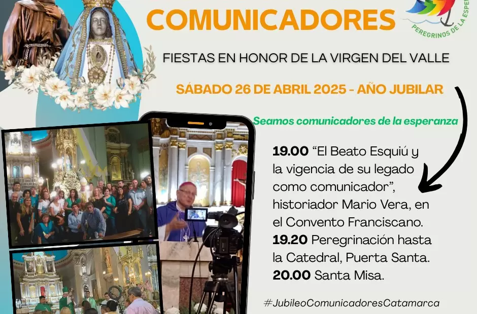 Los Comunicadores de la Diócesis de Catamarca quieren sumarse a esta celebración. Por tal motivo, la Pastoral de Comunicación Social y la Oficina de Prensa del Obispado, junto a colegas del medio, prepararon un programa de actividades. Así, invitan a adherir a esa celebración participando de una Jornada, en el marco de las fiestas en honor de Nuestra Madre del Valle, como verdaderos "Peregrinos de la Esperanza".