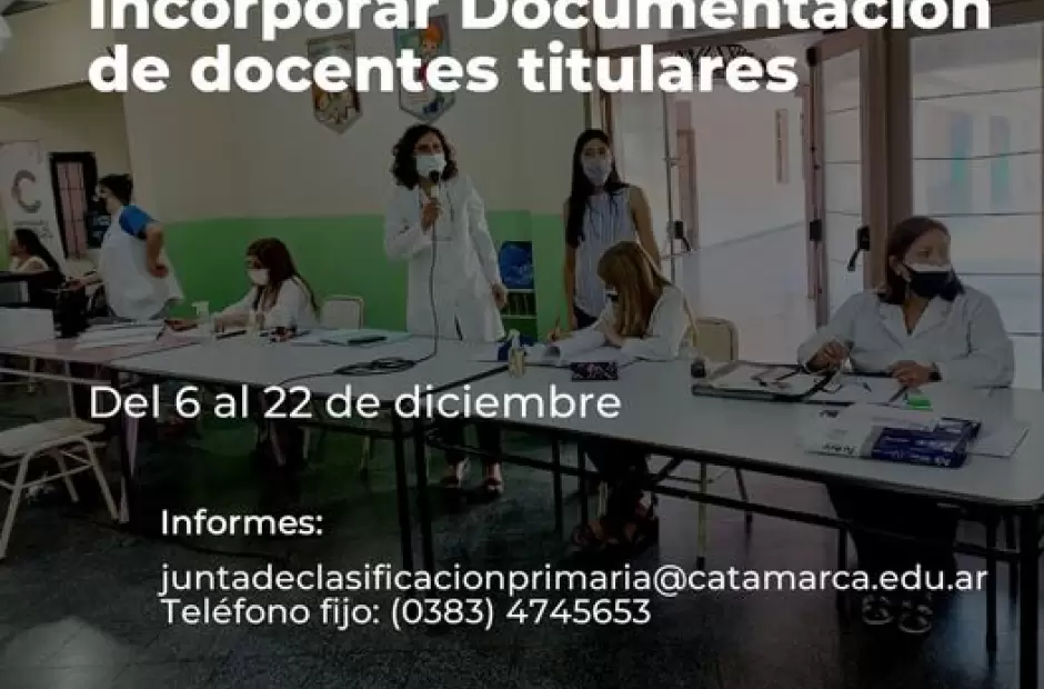 El Ministerio de Educación y la Junta de Clasificación de Nivel Inicial, Primario y Adulto informa a la comunidad educativa que desde el 6 al 22 de diciembre inclusive, del año en curso, se abre la convocatoria para incorporar documentación de docentes titulares de toda la provincia, que deben actualizar su Legajo Profesional en la mencionada Junta de Clasificación, tal cual lo establece el cronograma de actividades para cada año calendario.