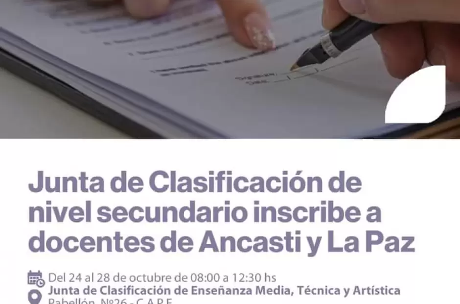 El Ministerio de Educación y la Junta de Clasificación de Enseñanza Media, Técnica y Artística, informaron que la Inscripción Ordinaria Período 2023 - ZONA IX: ANCASTI - LA PAZ, se realizará desde el 24 al 28 de octubre en el horario de 8:00 a 12:30 horas, en el Pabellón Nº26 del C.A.P.E.