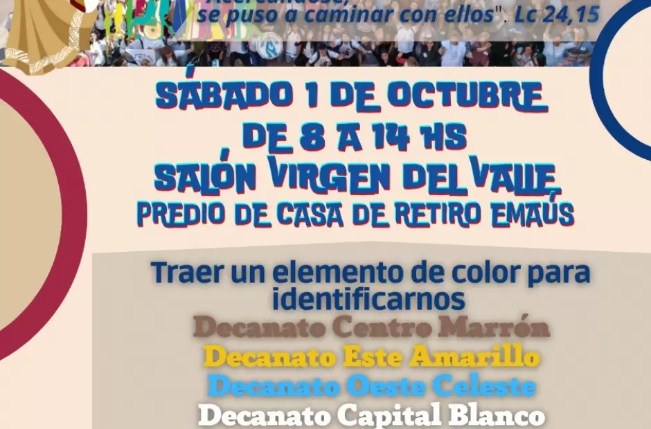 Según se informó, ya están inscriptos alrededor de 600 participantes de todo el territorio diocesano, quienes deben llevar un elemento del color que identifique a su Decanato: blanco, Capital; celeste, Oeste; marrón, Centro; y amarillo, Este.