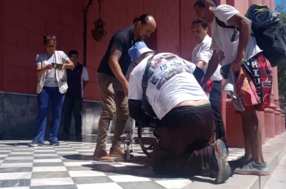 El recorrido se sostiene con un esquema que él mismo fue ajustando con el paso del tiempo: realiza parte del viaje en colectivo hasta llegar al límite de Catamarca y, desde ese punto, continúa por sus propios medios. Ya en la silla, sobre la banquina de la Ruta 38, empuja con fuerza cada metro del camino que lo acerca a la Catedral. El cansancio, el calor y las limitaciones físicas no lo detienen.