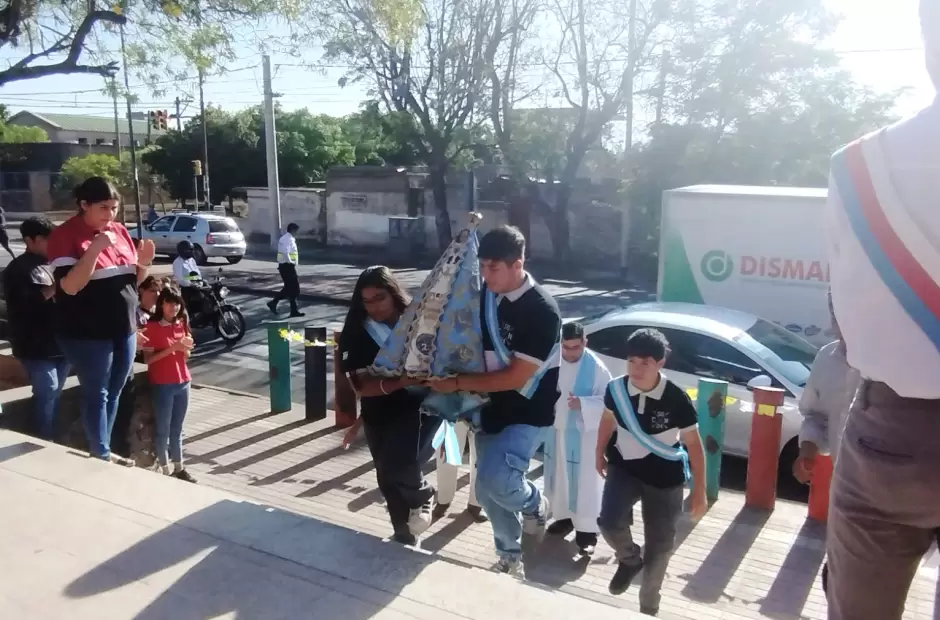 En la puerta del establecimiento educativo, adornado para la ocasión, la esperaban los abanderados y escoltas junto con los directivos, docentes y de demás personal que allí trabaja. Dos jóvenes escoltas de la bandera llevaron a la Madre Morena hasta el altar dispuesto en el ingreso al patio, donde se ubicó la formación de estudiantes, quienes la recibieron con entusiasmo, aplausos y canciones guiadas por los profesores de la escuela.