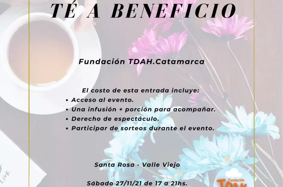 La Fundación TDAH.Catamarca organiza un té a beneficio que se realizará este sábado 27 de noviembre a las 17:00, en la casa de Té Escondida, ubicada en Valle Viejo. Las entradas son numeradas e incluyen:
