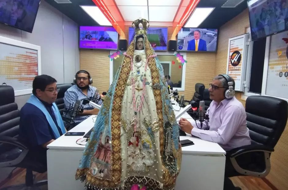 El conductor Jorge Álvarez, acompañado del locutor Matías Yapura, fue el encargado de recibir a la Ilustre Visitante, quien ingresó al estudio de la radio en los brazos del padre Gustavo Flores, rector del Santuario Catedral, compartiendo este momento con la audiencia. El sacerdote guió la oración elevada a Dios por intercesión de la Madre Morena rogando por la paz en el mundo especialmente en territorio Israelí; por nuestra Patria y todos los ciudadanos, que nos aprestamos a participar de los comicios para elegir a nuestros gobernantes. Todos juntos rezaron la Oración por la Patria y recibieron la bendición final.