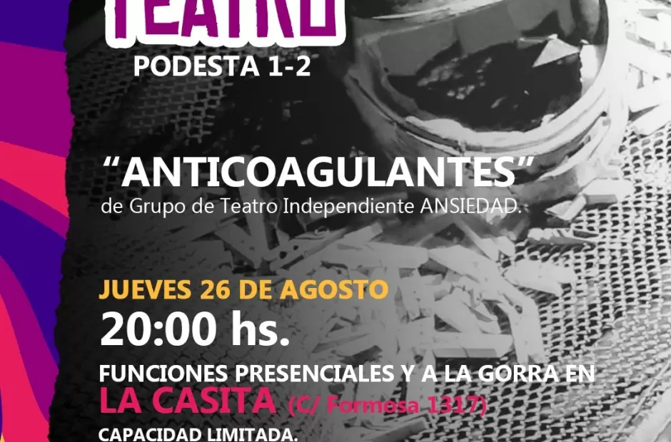 El jueves 26 de agosto a las 20 horas se presenta “Anticoagulantes”, del Grupo de Teatro independiente Ansiedad, en La Casita, ubicada en la calle Formosa 1317 de esta capital, continuando la programación de este ciclo prevista para el mes de agosto.
