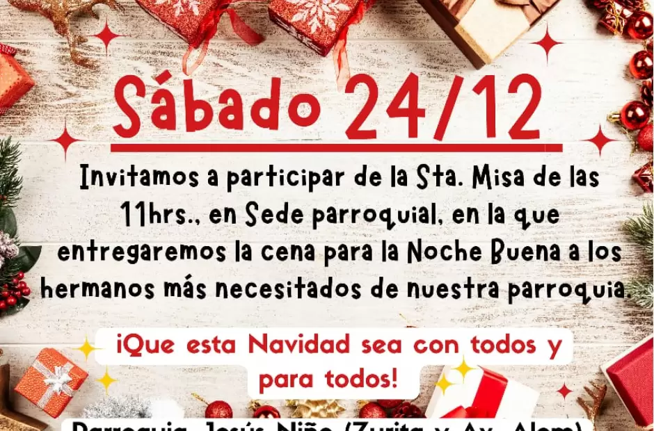 Este sábado 24 de diciembre a las 11.00, se celebrará la Santa Misa en la que se hará entrega de las viandas de Navidad a 100 familias de la comunidad parroquial de Jesús Niño.