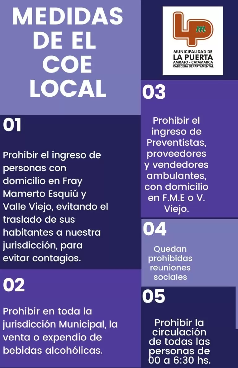 Ahora el COE de la Municipalidad de La Puerta anuncia que por la situación epidemiológica del coronavirus de sus vecinos departamentos, dispone el no ingreso de personas provenientes de Valle Viejo y Fray Mamerto Esquiú. La polémica decisión, subida en el Face de la comuna, sentencia "prohibir el ingreso de personas con domicilio en Fray Mamerto Esquiú y Valle Viejo, evitando el traslado de sus habitantes a nuestra jurisdicción, para evitar contagios".