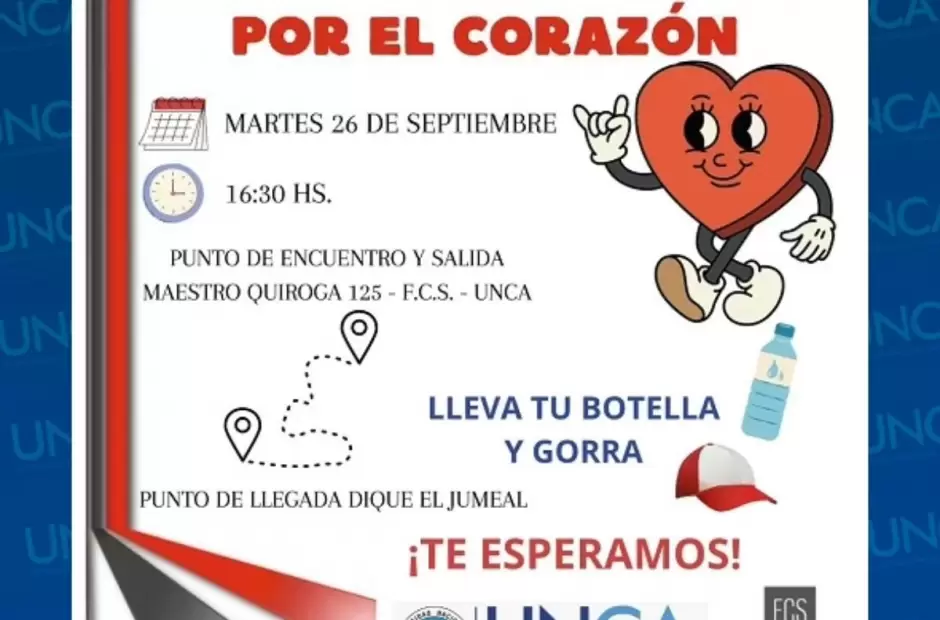 La actividad se llevará a cabo este martes 26 a las 16:30 horas. El punto de partida es la Facultad de Ciencias de la Salud de la UNCA, ubicada en la calle Maestro Quiroga 125 y el punto de destino será el dique El Jumeal. Este evento es, sin dudas, una oportunidad para que estudiantes, docentes y el público en general se unan para favorecer su salud cardiovascular y, además, se cree conciencia sobre los factores de riesgo y la prevención de enfermedades cardiovasculares.