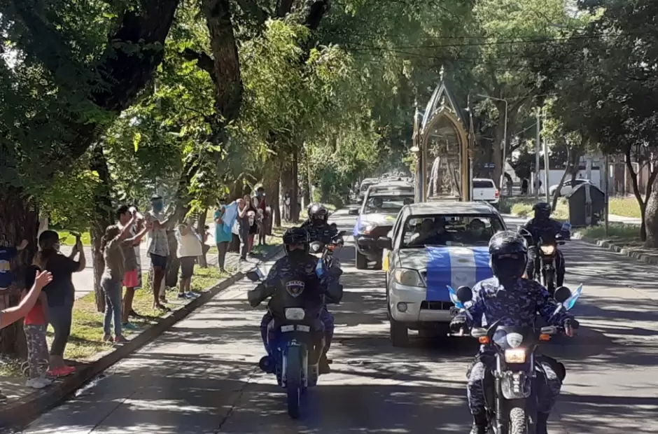 En horas de la mañana, la imagen peregrina de la Madre Morena partió desde su Santuario, llevada por el Obispo Diocesano, Mons. Luis Urbanc, y escoltada por personal de la Policía de la Provincia y de la Guardia Urbana, quienes que además de anunciar y acompañar a tan Ilustre Visitante, tienen la misión de resguardar la seguridad de los vecinos.