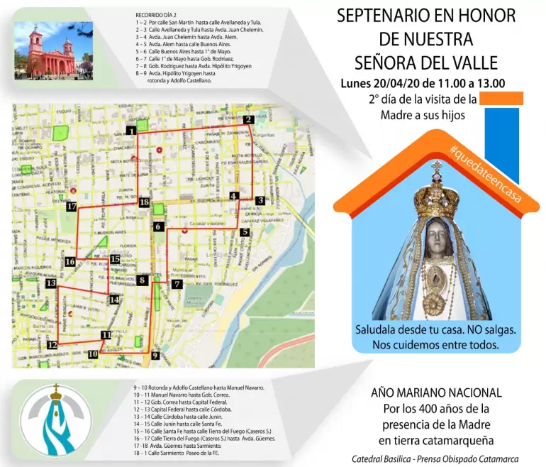 Siguiendo la consigna que nos invita a quedarnos en nuestras viviendas, para detener la pandemia que nos aflige - #quedateencasa? se solicita especialmente a los hijos de la Virgen del Valle, que la saluden cuando pase por sus casas, desde la puerta, la ventana, el balcón o el techo, pero no salir del hogar, para cuidarnos y cuidar a nuestros hermanos.