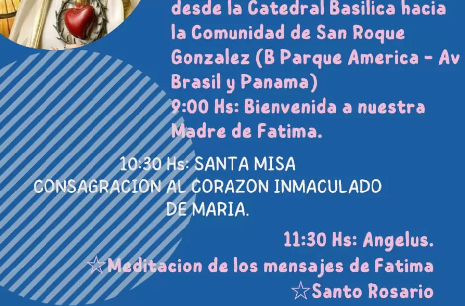 El domingo 7 de noviembre, la imagen peregrina de la Virgen de Fátima visitará la parroquia de la Santa Cruz, con sede en el barrio Altos de Choya, zona norte de Capital. Durante la jornada permanecerá en la capilla San Roque González del barrio Parque América.
