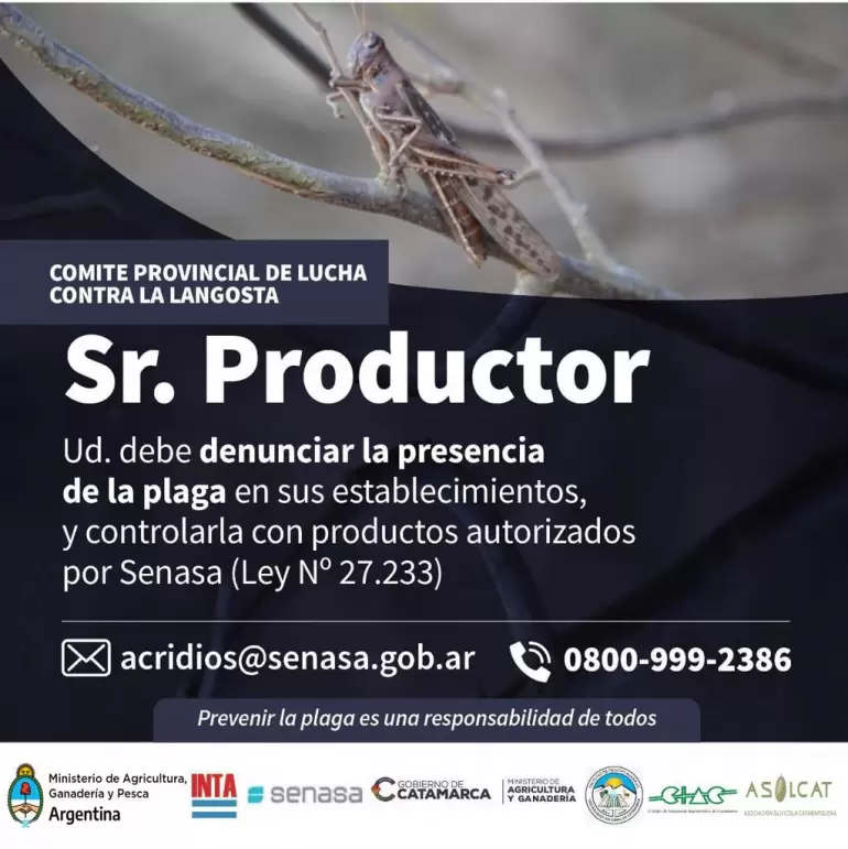 El Servicio Nacional de Sanidad y Calidad Agroalimentaria (Senasa) emitió un alerta advirtiendo que una manga de grandes dimensiones de langostas avanza hacía las localidades del oeste catamarqueño. La referente del Programa Nacional de Langostas en la provincia, Evelyn Ledesma, pidió a la comunidad informar sobre el avistaje de langostas que se encuentra en movimiento por la presencia de vientos en la zona.