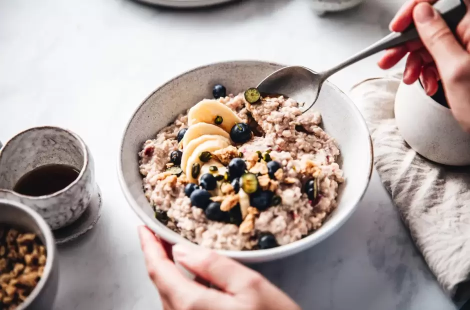 Avena cocida con frutas y semillas: Preparada en agua o bebida vegetal, acompañada de manzana rallada, banana o frutillas, y semillas de chía o lino, que aportan omega-3 vegetal y mucílagos para reducir la inflamación y mejorar los niveles de colesterol.