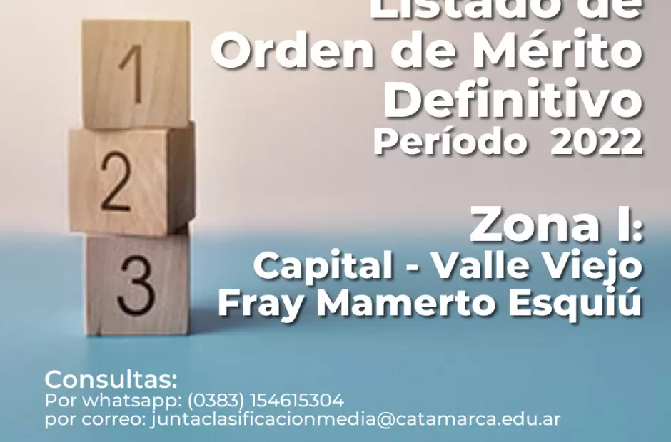 El Ministerio de Educación y la Junta de Clasificación de Enseñanza Media, Técnica y Artística, informa a los docentes de Nivel Secundario ZONA I: CAPITAL-VALLE VIEJO- FME que fue emitido el LISTADO DE ORDEN DE MÉRITO DEFINITIVO PERIODO 2022.