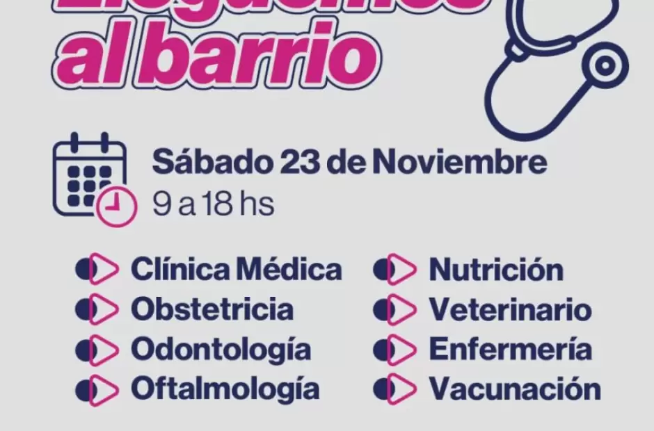 El Ministerio de Salud de la Provincia, a través del Programa Lleguemos al Barrio, brindará asistencia este sábado 23 de noviembre en el Centro de Desarrollo Infantil de Nueva Coneta, departamento Capayán, de 9 a 18 horas.