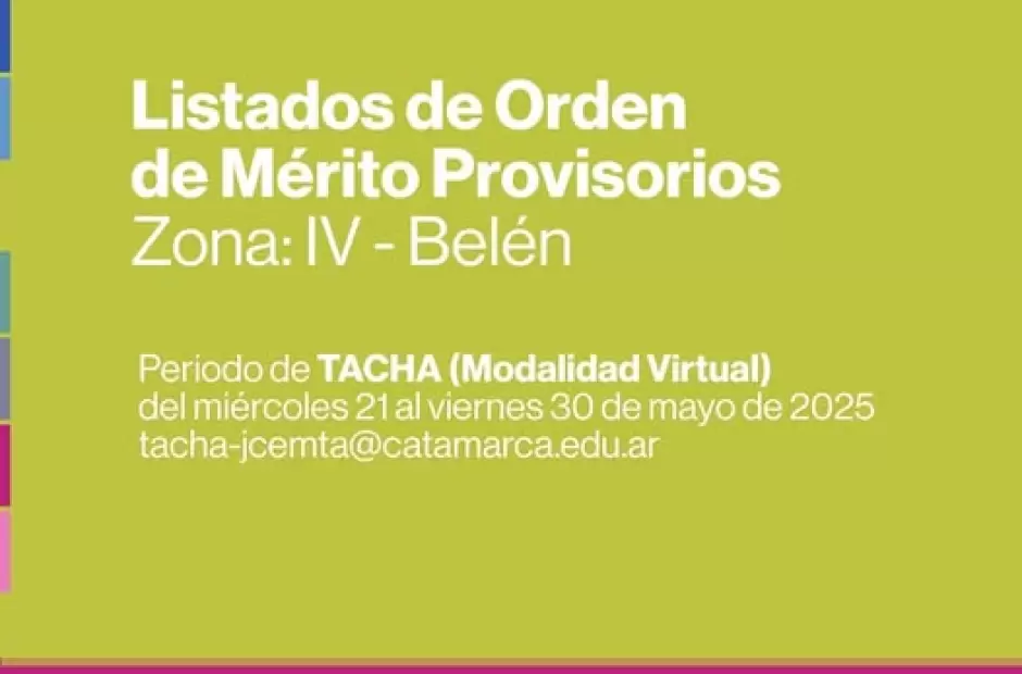 La Junta de Clasificación de Enseñanza Media, Técnica y Artística informó que ya se encuentra publicado el Listado de Orden de Mérito Provisorio 2025 para zona IV (Belén) en nuestra página oficial: www.catamarca.edu.ar