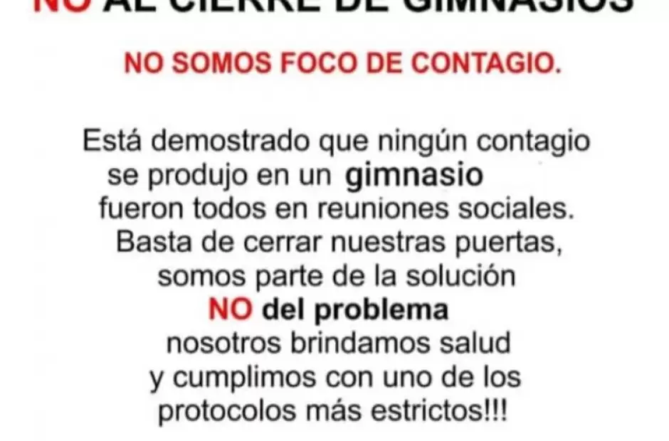 La Cámara de Gimnasios de Catamarca, que nuclea a más de 50 gimnasios del Valle Central de la provincia argumenta, vía redes sociales y comunicado que van a solicitar poder funcionar. Basan su pedido en la premisa que ellos no se consideran foco de contagio. En el posteo de las redes señalan “está demostrado que ningún contagio se produjo en un gimnasio, fueron todos en reuniones sociales”.