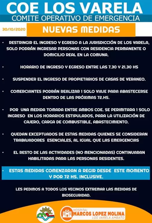 El COE de Los Varela informó que decidió restringir el ingreso y egreso en su jurisdicción desde hoy y por el plazo de 72 hs.