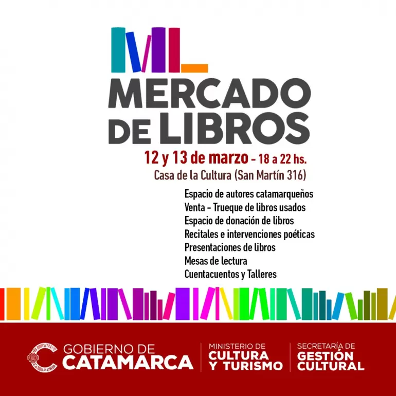Este viernes 12 y sábado 13 de marzo la Casa de la Cultura de Catamarca, en San Martín 533, albergará la 1º edición del Mercado de Libros con espacio de feria para autores y editoriales catamarqueñas, venta y trueque de libros usados, además de otras propuestas vinculadas a la promoción de la lectura. Ambas jornadas, el mercado estará abierto al público de 18 a 22 hs.