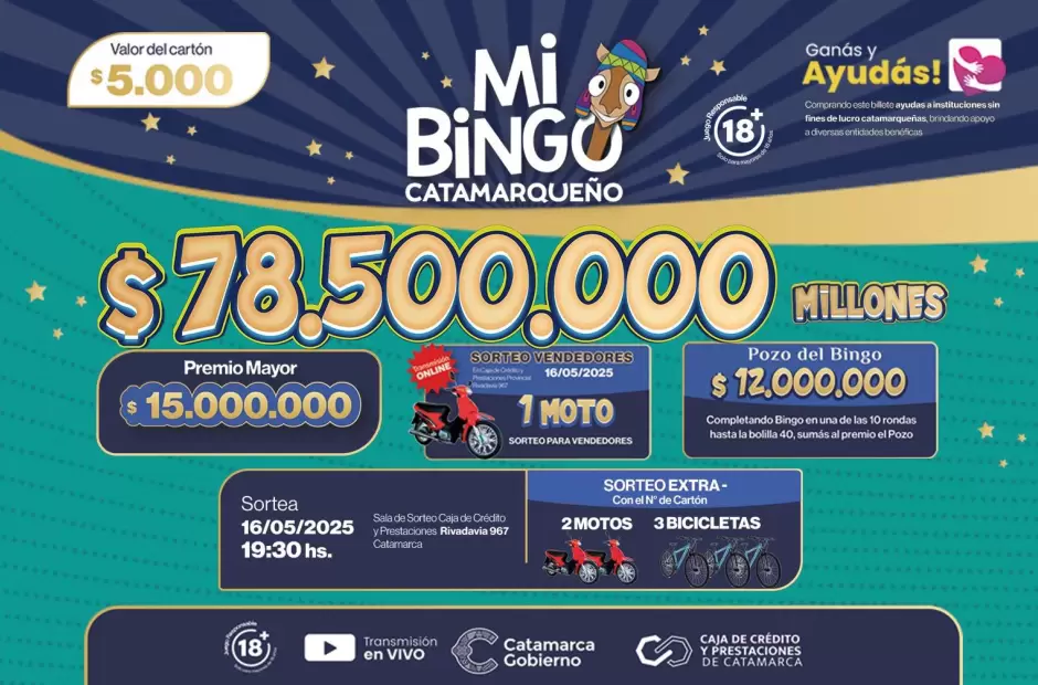 La provincia se prepara para vivir una jornada única de emoción y solidaridad con el sorteo de Mi Bingo Catamarqueño, que repartirá más de $78.000.000 en premios el próximo viernes 16 de mayo, a las 19:30 horas. El evento se llevará a cabo en la Sala de Sorteo de la Caja de Crédito y Prestaciones, ubicada en Rivadavia 967, en San Fernando del Valle de Catamarca, y será transmitido en vivo por Radio Valle Viejo FM 104.1 y en todas sus plataformas.