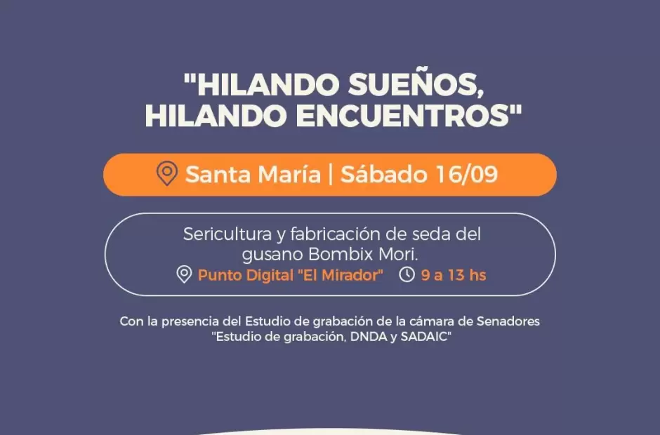 Por otra parte, el sábado 16 también se abordará sus contribuciones a la sericultura y la fabricación de seda del gusano Bombix Mori. El evento se desarrollará en el Punto Digital "El Mirador" de 9 a 13 horas y contará con la destacada presencia del Estudio de grabación de la cámara de Senadores, así como DNDA y SADAIC.