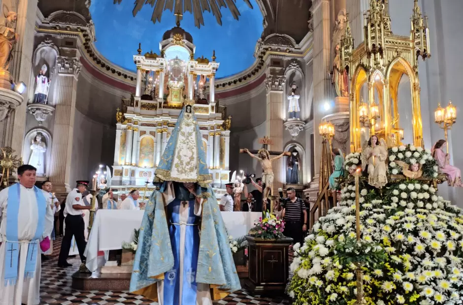 Animados por el lema "Peregrinos de esperanza", desde las 18.30 se realizó la tradicional Bajada de la Imagen, que fue descendida desde el Camarín hasta el Presbiterio. La Imagen cuatro veces centenaria fue llevada en brazos por el obispo diocesano, Mons. Luis Urbanc, acompañado por sacerdotes del clero catamarqueño, entre ellos el vicario general, padre Julio Murúa, y el rector del Santuario Catedral, padre Juan Ramón Cabrera.