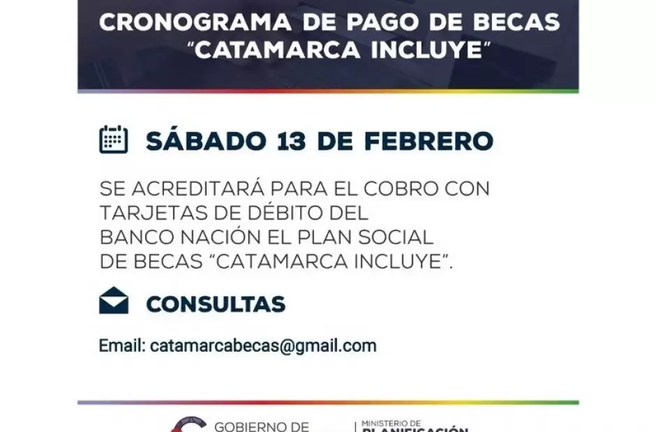 El Ministerio de Planificación y Modernización dio a conocer las fechas de pago para el programa de becas plan social “Catamarca Incluye” del mes de Febrero.