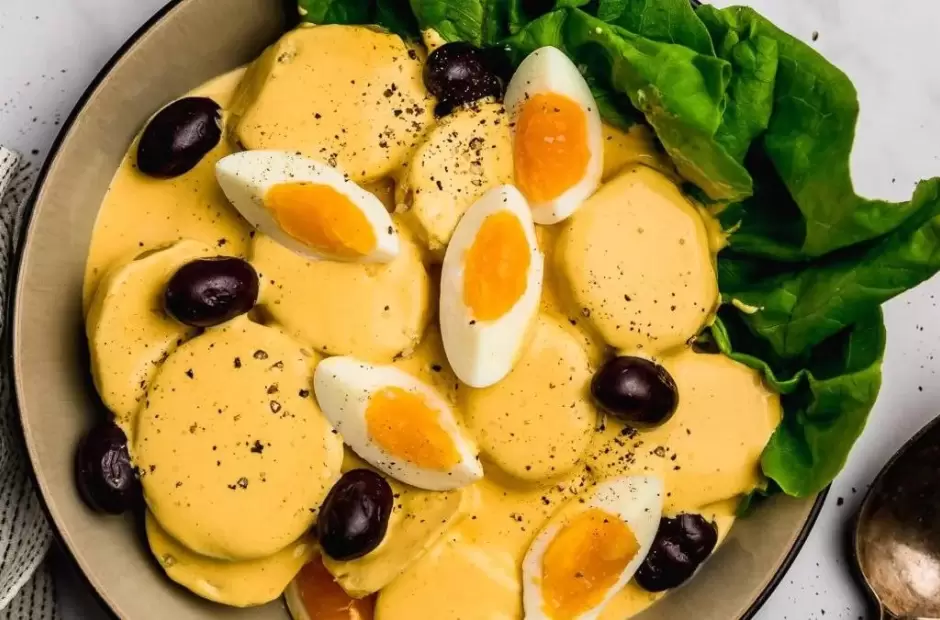 4. Dispón las rodajas de papas en una fuente y báñalas generosamente con la salsa huancaína. Si quieres, decora con huevo duro en rodajas, aceitunas negras y hojas de lechuga o cilantro.