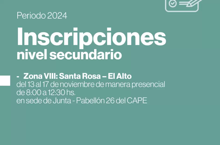 El Ministerio de Educación y la Junta de Clasificación de Enseñanza Media, Técnica y Artística informa a los docentes de Nivel Secundario de ZONA VIII: SANTA ROSA – EL ALTO que se llevarán a cabo las INSCRIPCIONES PERIODO 2024, a los efectos de la cobertura de Cargos y Horas Cátedras, para Interinatos y Suplencias, a partir del día LUNES 13 al 17 DE NOVIEMBRE del año en curso, en el horario de 8:00 a 12:30 hs., en la sede del organismo, ubicado en el Pabellón N°26 del C.A.P.E.