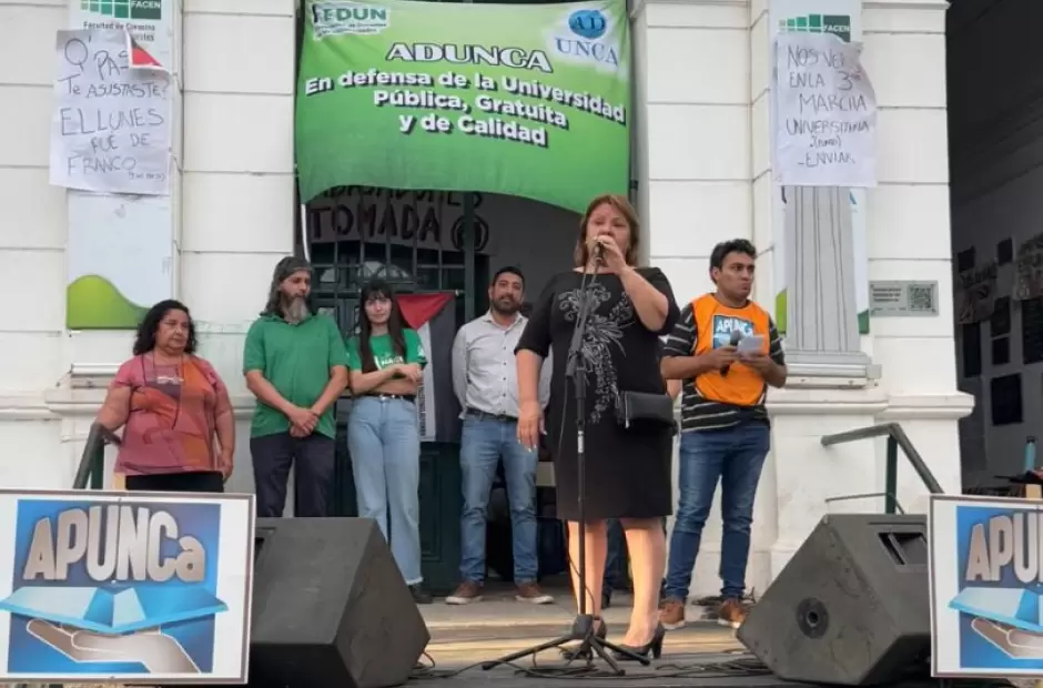 La secretaría general del gremio APUNCa y actual diputada, Gladys Moro, brindó unas palabras acompañada por la secretaria del gremio ADUNCA, Gloria Quevedo, el
