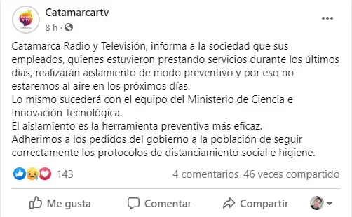El edificio del Canal de Catamarca Radio y TV, permanecerá cerrado por los próximos días a raíz que sus empleados realizarán el aislamiento de modo preventivo. Lo mismo sucederá con el equipo del Ministerio de Ciencia e Innovación Tecnológica, que comparte el edificio con el canal de TV Pública.