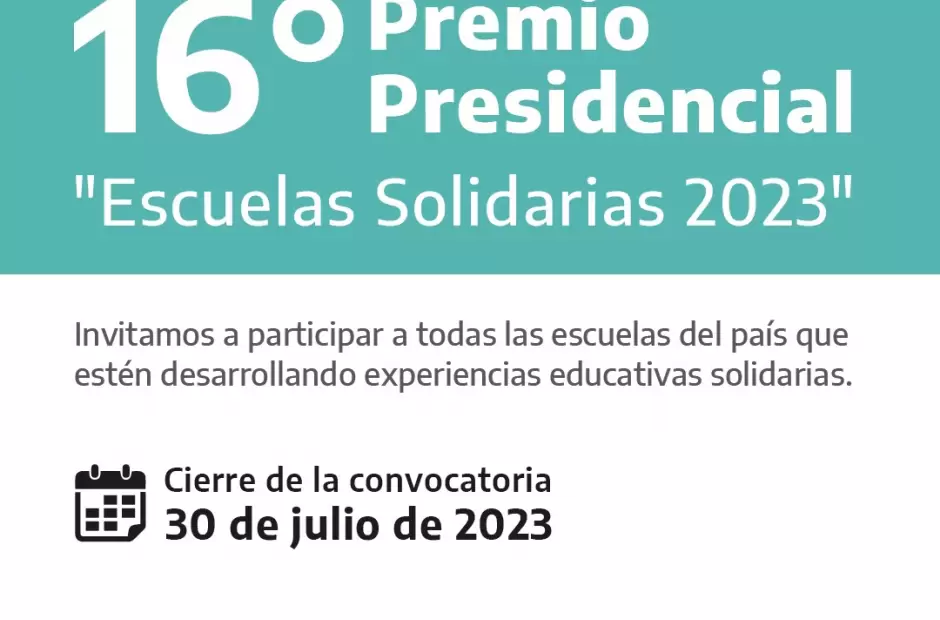 El Ministerio de Educación a través del equipo jurisdiccional del programa nacional “Educación Solidaria”, convoca a todas las instituciones educativas de la provincia que se encuentren desarrollando experiencias educativas solidarias, a participar del Premio Presidencial “Escuelas Solidarias” 2023. Para ello, las escuelas de gestión estatal o privada de los niveles inicial, primario y secundario y de todas las modalidades reconocidas, deberán presentar su experiencia a través del siguiente formulario online, que está disponible para su carga hasta el 30 de julio de 2023: https://bit.ly/44uNUEx