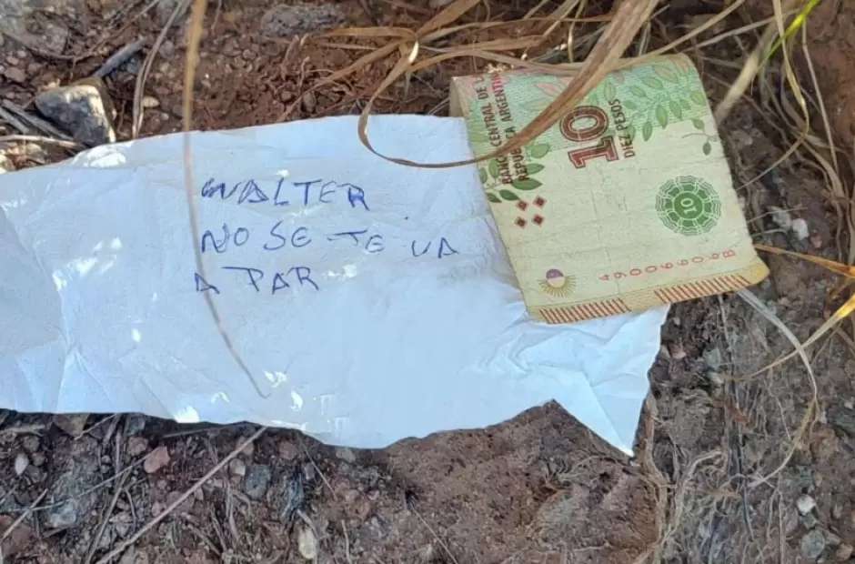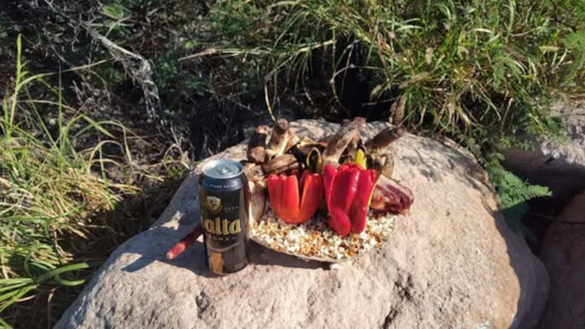 Según reportaron medios locales, el ritual estaba montado sobre una roca e incluía varios objetos: dos morrones, pochoclos, una lata de cerveza, carne cruda, bananas en avanzado estado de descomposición y, lo más impactante, un papel acompañado por un billete de 10 pesos que decía: "Walter, no se te va a par...".