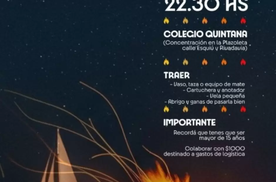 Los participantes deben llevar taza o equipo de mate, cartuchera y anotador, una vela pequeña, abrigo y ganas de compartir esta experiencia de fe en un clima de mucha alegría.