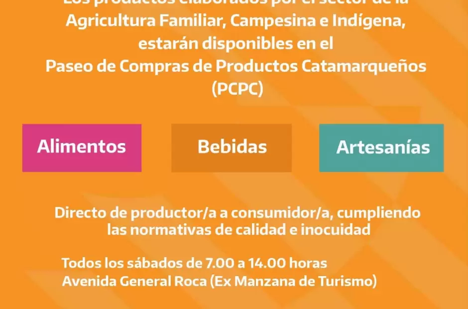 El próximo 2 de octubre se inaugurará el stand permanente de productos elaborados por el sector de la Agricultura Familiar, Campesina e Indígena (AFCI) de Catamarca, en el Paseo de Compras de Productos Catamarqueños (PCPC) que funciona todos los sábados de 7 a 14 horas, en la calle General Roca (ex Manzana de turismo).