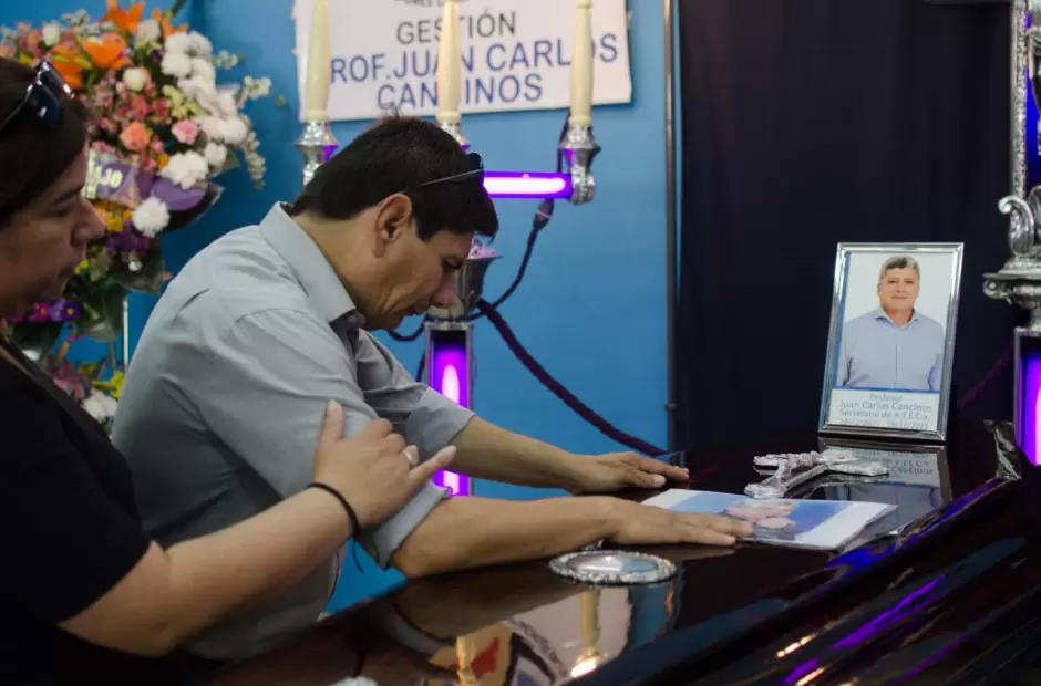 Escenas de profundo dolor se vivieron este lunes durante el velatorio al profesor Juan Carlos Cancinos, secretario general del gremio ATECA y a la profesora Juana del Valle Giménez, quienes fallecieran el domingo a raíz de un terrible accidente sobre la Ruta Nacional 38. Ambos dirigentes fueron despedidos con hondo pesar en la sede central de calle Zurita 768. Ese fue el lugar en donde docentes, amigos, familiares, representantes de la comunidad educativa y del gobierno provincial despidieron al dirigente y titular del gremio.