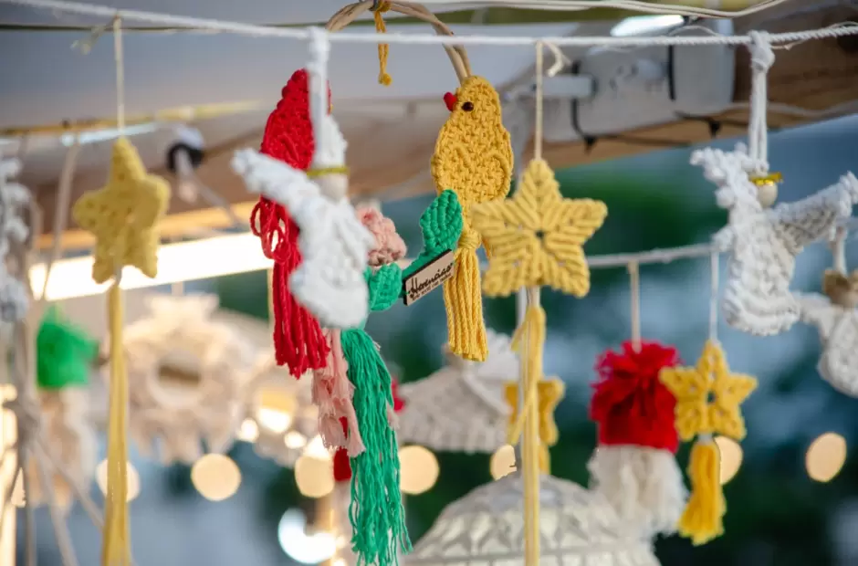 En el stand Las Huellas de Mi Madre, de Gabriela se destacan los textiles colgantes y el macramé todo con impronta navideña, ofrece arbolitos tejidos en macramé, coronas para puerta, colgantes con motivos navideños desde $30000, centros de mesa que arrancan de $10000.