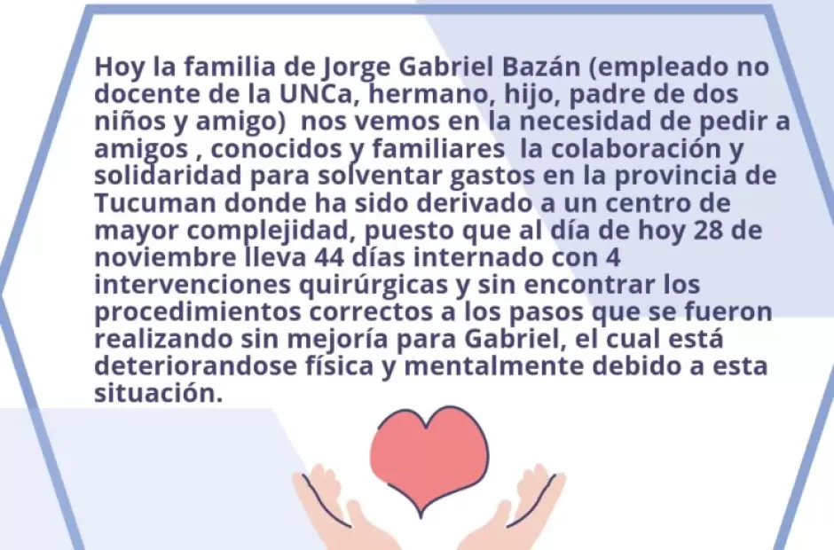 La familia y amigos de Gabriel Bazán, un empleado no docente de la Universidad de Catamarca, apelan a la solidaridad de la comunidad en general para poder sortear la difícil situación respecto a su salud.
