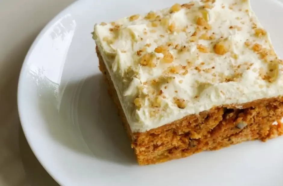 En caso de que quieras darle un aspecto similar al de un carrot cake puedes añadir un frosting, para hacerlo te recomendamos mezclar 5 cucharadas de yogurt griego con 5 cucharadas de queso crema y dos de miel. Luego unta sobre el bizcocho y decora con zanahoria rallada y trocitos de nuez.