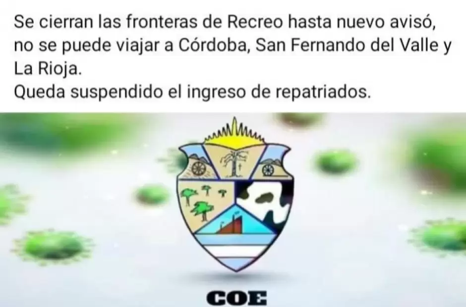 Recreo cierra nuevamente sus límites departamentales hasta nuevo aviso. Con esta medida quedan imposibilitados el ingreso y egreso con la ciudad Capital y con las vecinas provincias de La Rioja y Córdoba. El anuncio lo dió el COE de ese departamento, quien también informó que la llegada de los repatriados también queda suspendido.