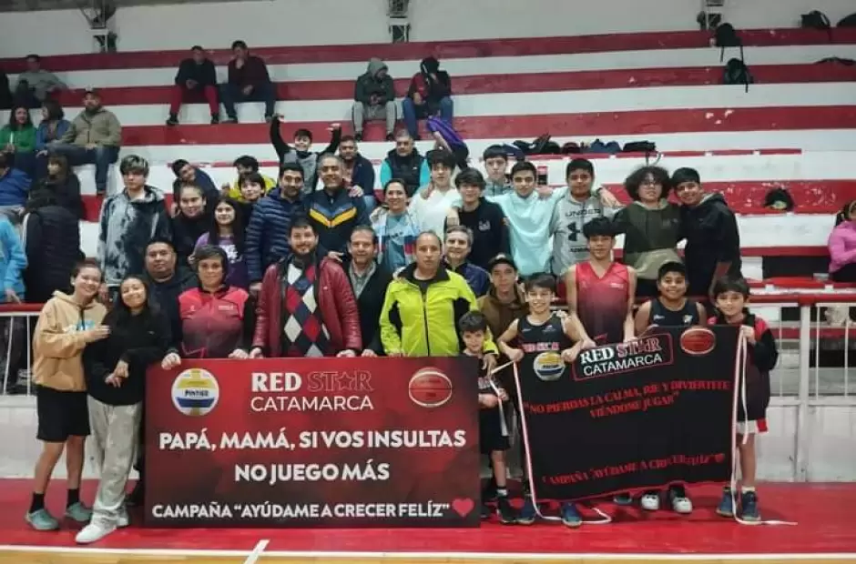 En el estadio Antonio Ricardo Bollea, donde la pasión por el básquet se encuentra en su máxima expresión, se erigió un cartel que simboliza el compromiso de la campaña "Ayudame a Crecer Feliz". Además, se alzó una bandera con un mensaje que llamó a la reflexión de todos los presentes: “papá, mamá, si vos insultás, no juego más”.