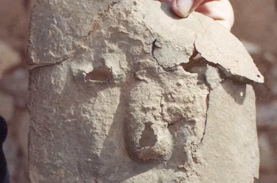 Esta máscara con forma de cara humana se encontraba en un entierro colectivo de al menos 14 personas entre adultos de ambos sexos y niños, cuyos restos estaban totalmente desarticulados y mezclados en una tumba que tenía solo una pared de piedras chatas dispuestas en un costado.