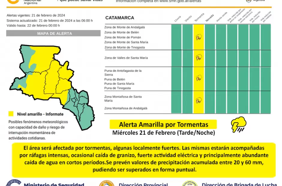 El alerta también incluye la zona montañosa de Andalgala, zona montañosa de Santa María, y zona de Valle de santa Maria.