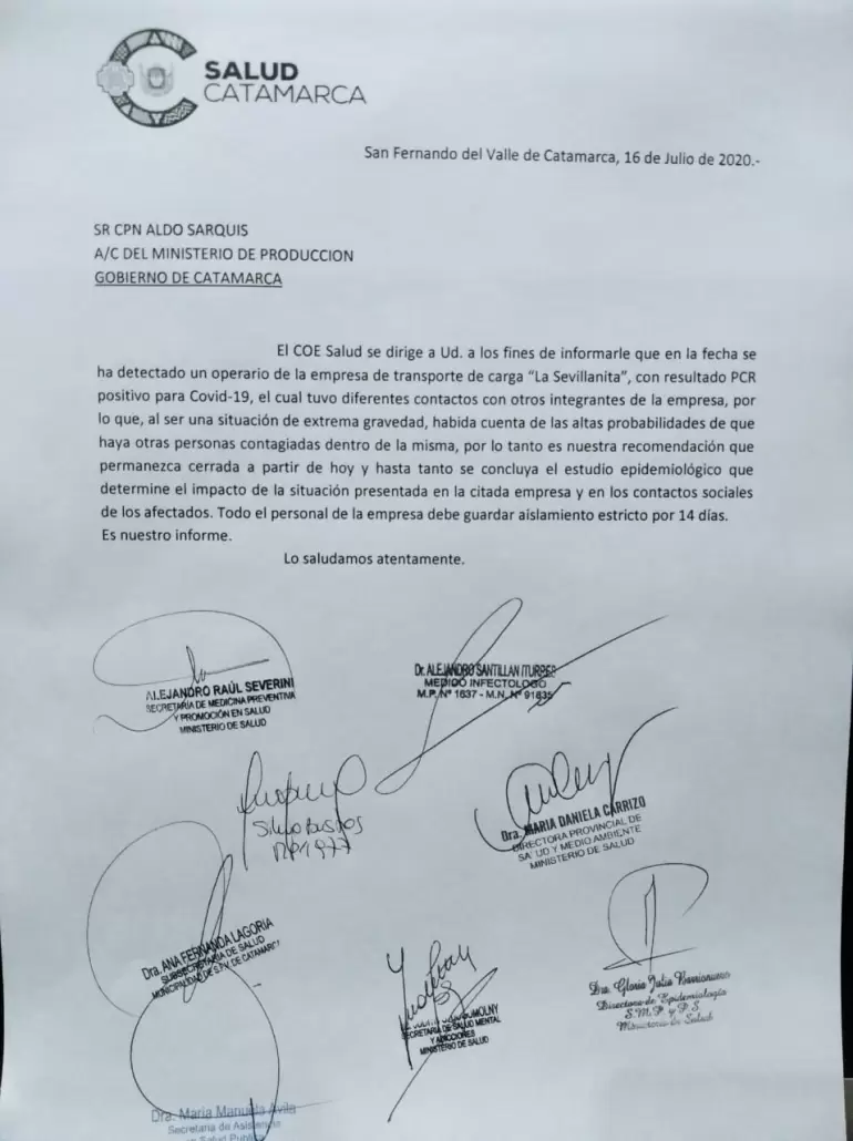 En la nota enviada por Salud a la empresa, que trascendió extraoficialmente, se habla que uno de los empleados de la firma es uno de los casos con Covid-19. Ante esto, la nota que lleva la firma del Secretario de medicina preventiva, Alejandro Severini, entre otros funcionarios, indica "el COE Salud se dirige usted a los fines de informarle que en la fecha se ha detectado un operario de la empresa de transporte de carga ´La Sevillanita´, con resultado PCR positivo para Covid-19, el cual tuvo diferentes contactos con otros integrantes de la compañía, por lo que, al ser una situación de extrema gravedad, habida cuenta de las altas probabilidades de que haya otras personas contagiadas dentro de la misma, por lo tanto es nuestra recomendación que permanezca cerrada a partir de hoy y hasta tanto se concluya el estudio epidemiológico que determine el impacto de la situación".