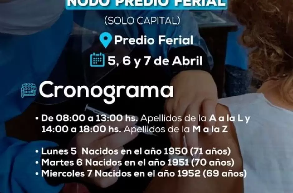 En cuanto al cronograma de esta semana, deben presentarse en el Nodo del Predio Ferial todas personas que cumplieron o cumplen 69, 70 o 71 años durante este. Deberán asistir con documento de identidad; por la mañana (de 8 a 13 horas) aquellas personas cuyo apellido comience con la A hasta la L inclusive y, por la tarde (de 14 a 18 horas), las que tengan apellido que comienza con las letras de la M a la Z.