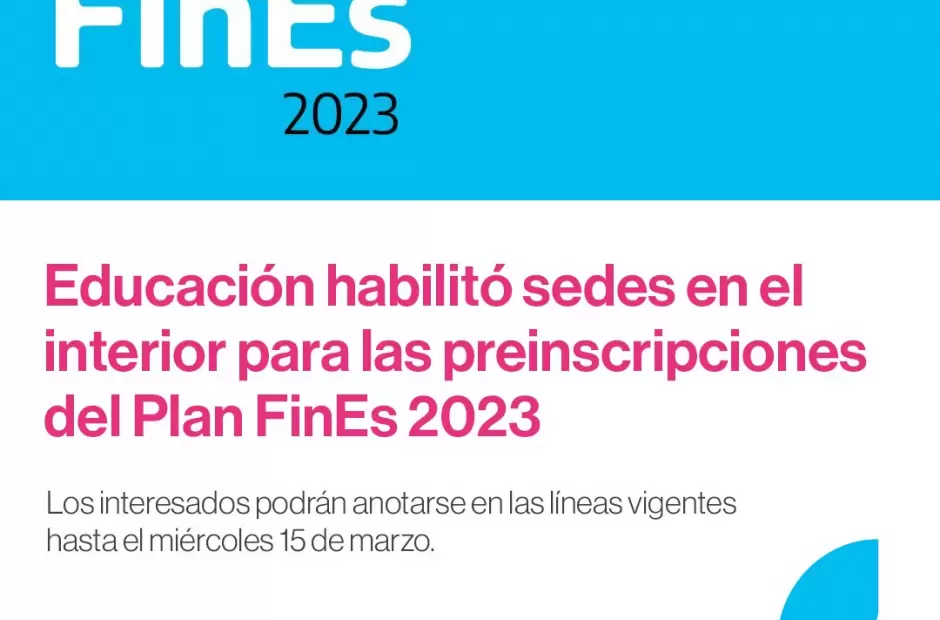 Asimismo, se recuerda que también se puede realizar la preinscripción al Plan FinEs 2023 a través del link dispuesto por el Ministerio de Educación de la Nación: https://fines.educacion.gob.ar/