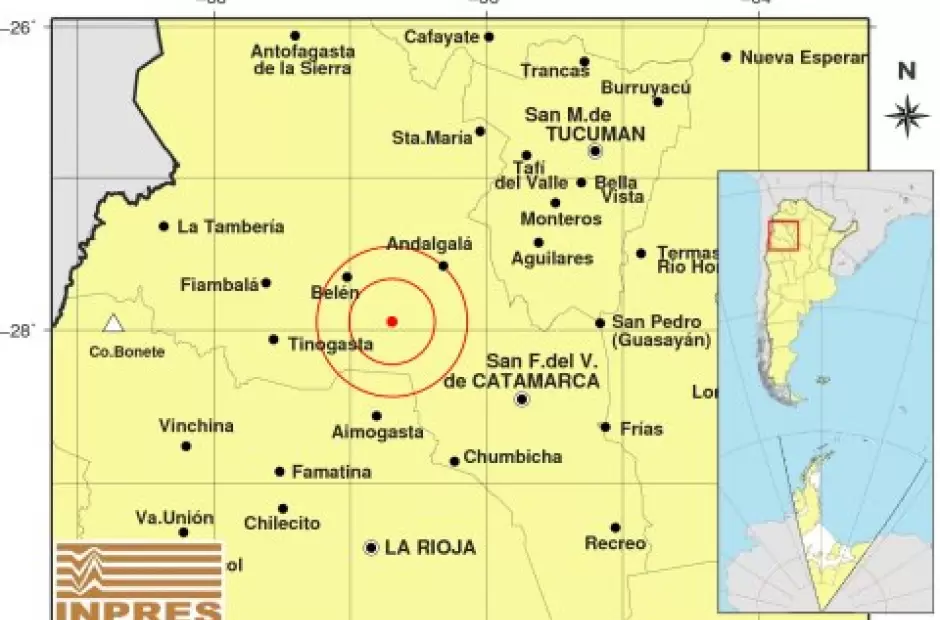 Según los registros del equipo del organismo nacional, el sismo se registró a las 08:15: a 109 kilómetros al noroeste de San Fernando del Valle de Catamarca y a 46 kilómetros al sudeste de Belén.