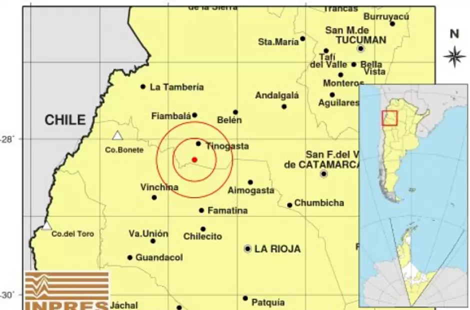 La ubicación del epicentro también se sintió en La Rioja, por lo que el INPRES terminó de determinar el radio del epicentro: 148 km al NO de La Rioja; 185 km al O de San F. Del Valle De Catamarca; 24 km al S de Tinogasta. La profundidad del sismo fue de 132 km de profundidad.