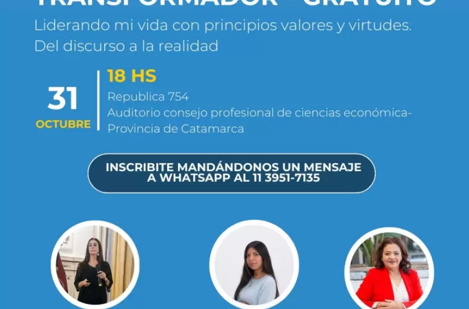 Con la premisa de "liderando mi vida, con principios, valores y virtudes; del discurso a la realidad", van a disertar María Campos Guzmán, quien en Lic. en Educación para la salud; Ayelen Alancay, dirigente de la Fundación Más vida y Roxana Costilla, consultora de Recursos Humanos y coach.